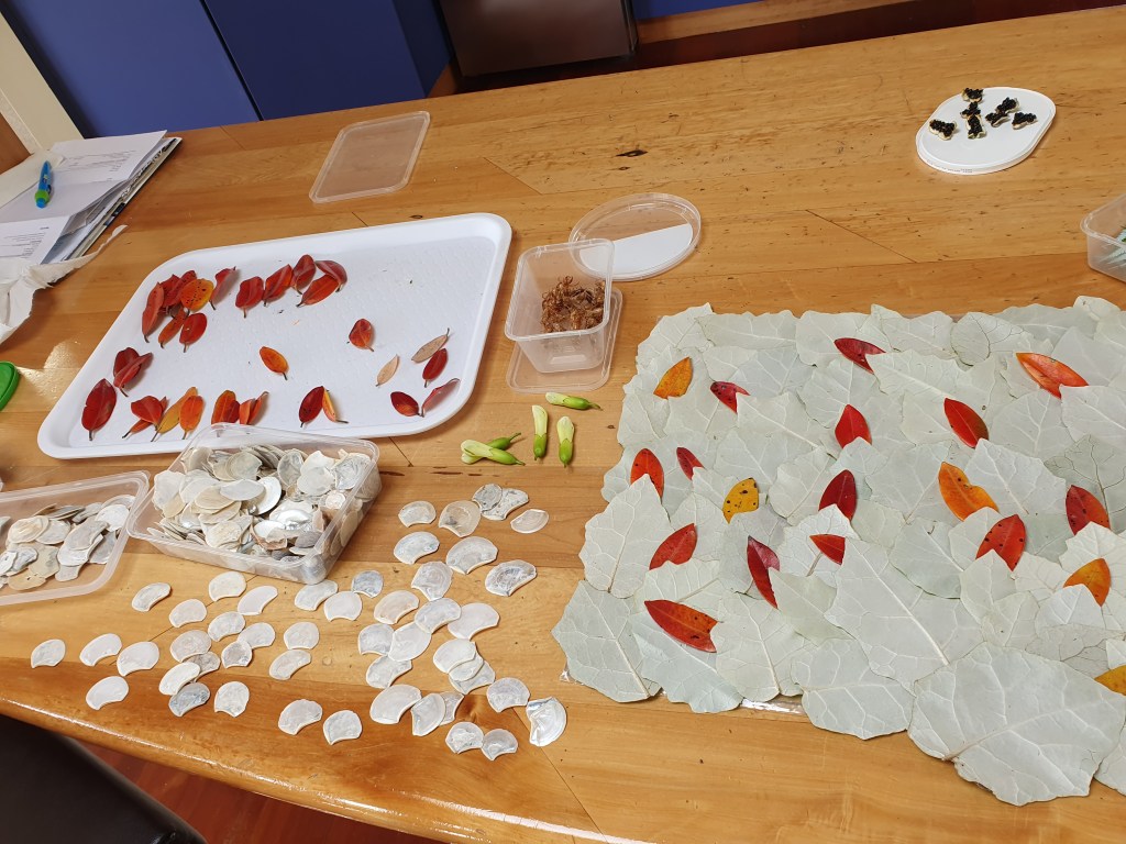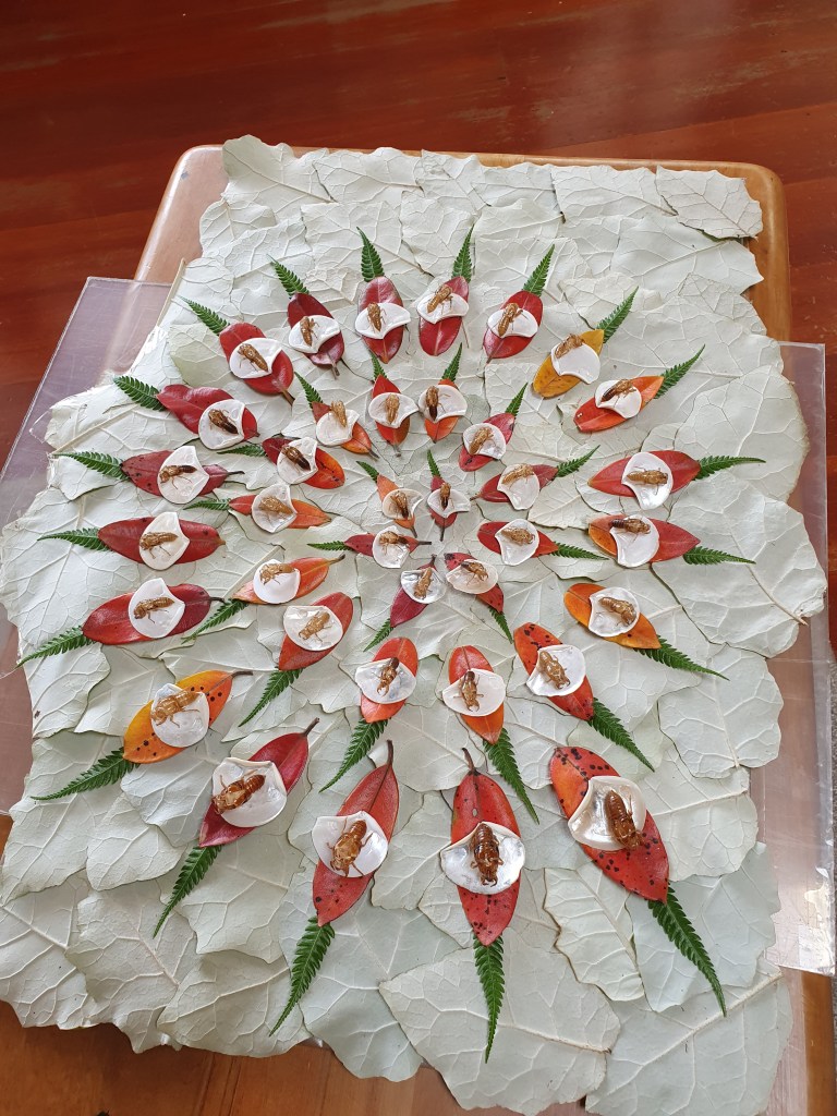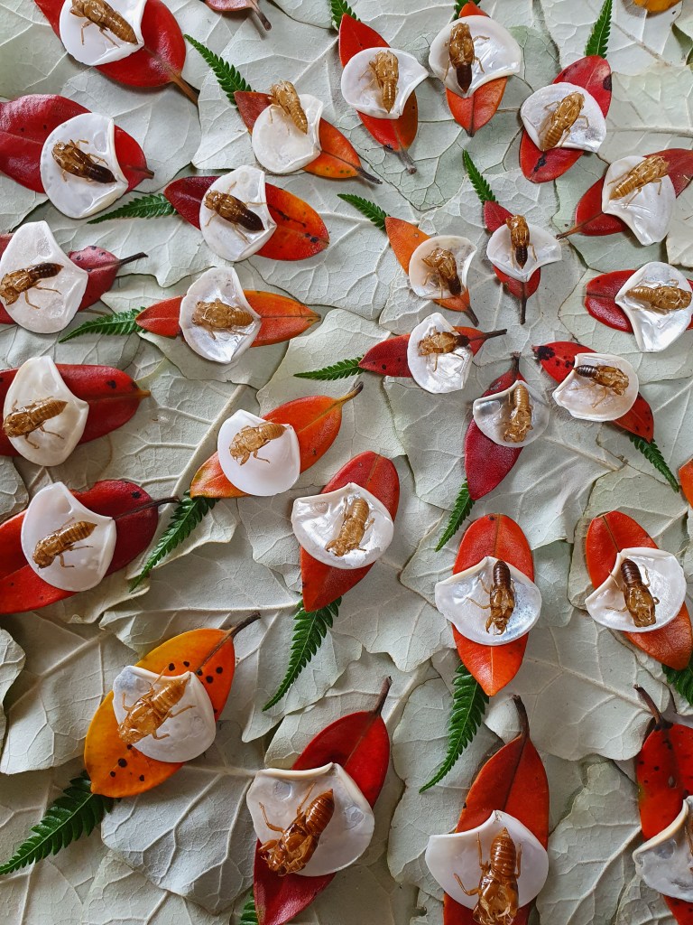 Empty kihikihi/cicada (Amphipsalta species) skins with pukira/battleaxe clam shells (Myadora striata), red and orange pōhutukawa leaves (Metrosideros excelsa), ponga/silver fern fronds(Cyathea dealbata), and the white underside of rangiora (Brachyglottis repanda) leaves. Thank you Debra Shuker for the pukira shells.