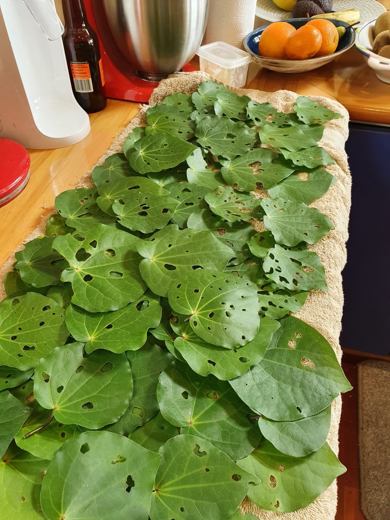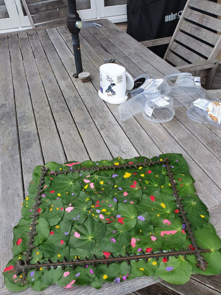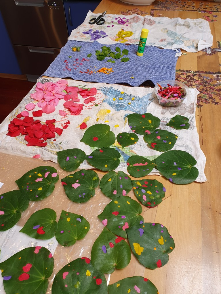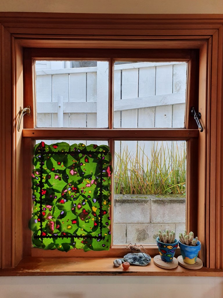 ‘Kawakawa Leaf Leadlight’, with colour from petals of kowhai, camellia, periwinkle, polygala, gorse, and marigold flowers. The holes in kawakawa leaves are made by kawakawa looper moth caterpillars – and despite leaves almost always being extremely ‘holey’, the caterpillars are weirdly hard to find. plantart.nz