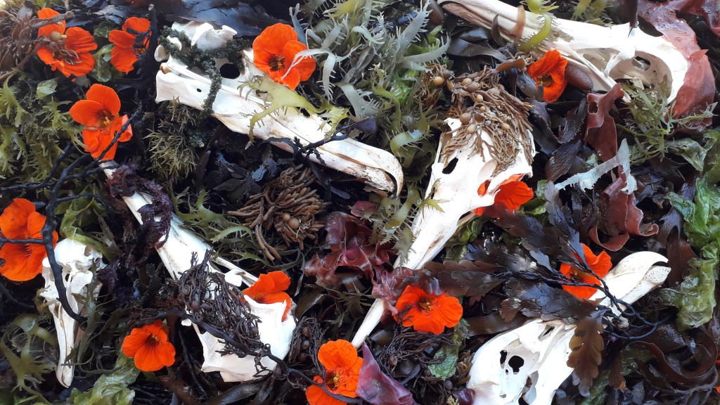 My original plan was to make a picture out of seaweed, mollymawk (small albatross) skulls and nasturtium flowers (Tropaeolum majus), but the white of the skulls was too hard to photograph against the dark seaweed (me being an amateur and mostly just using my phone!). (But – see my other picture called Wildflowers and mollymawks).